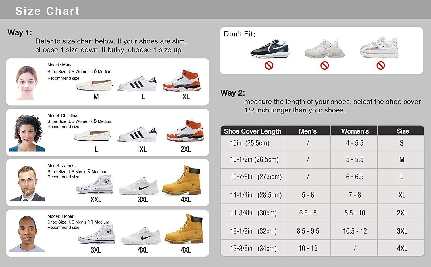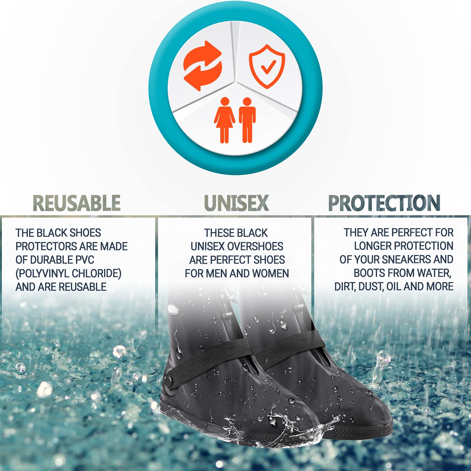 1.Pack of 4 Waterproof Shoe Covers for Men and Women 2 X-Large. Elevate your footwear with these black reusable shoe covers. Shoe rain covers will keep your new shoes pristine in all weather conditions.