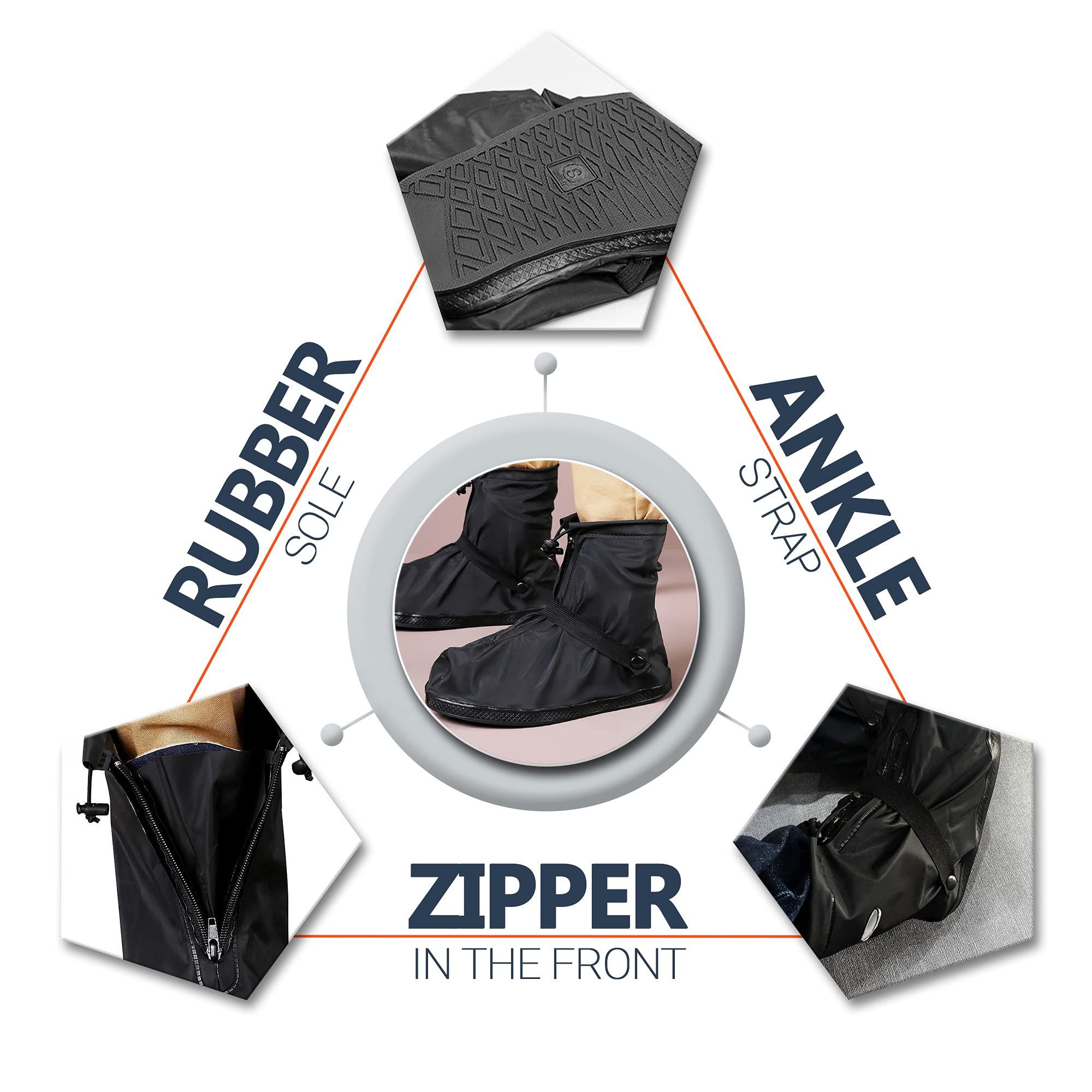 3.Seamless Fusion of Form and Function. The ankle strap reliably fixates the shoe covers reusable on foot. The convenient side zipper provides fast closing, and an adjustable drawstring on the top of waterproof shoes cover offers a snug fit, sealing your shoes against spills and grime with style.
