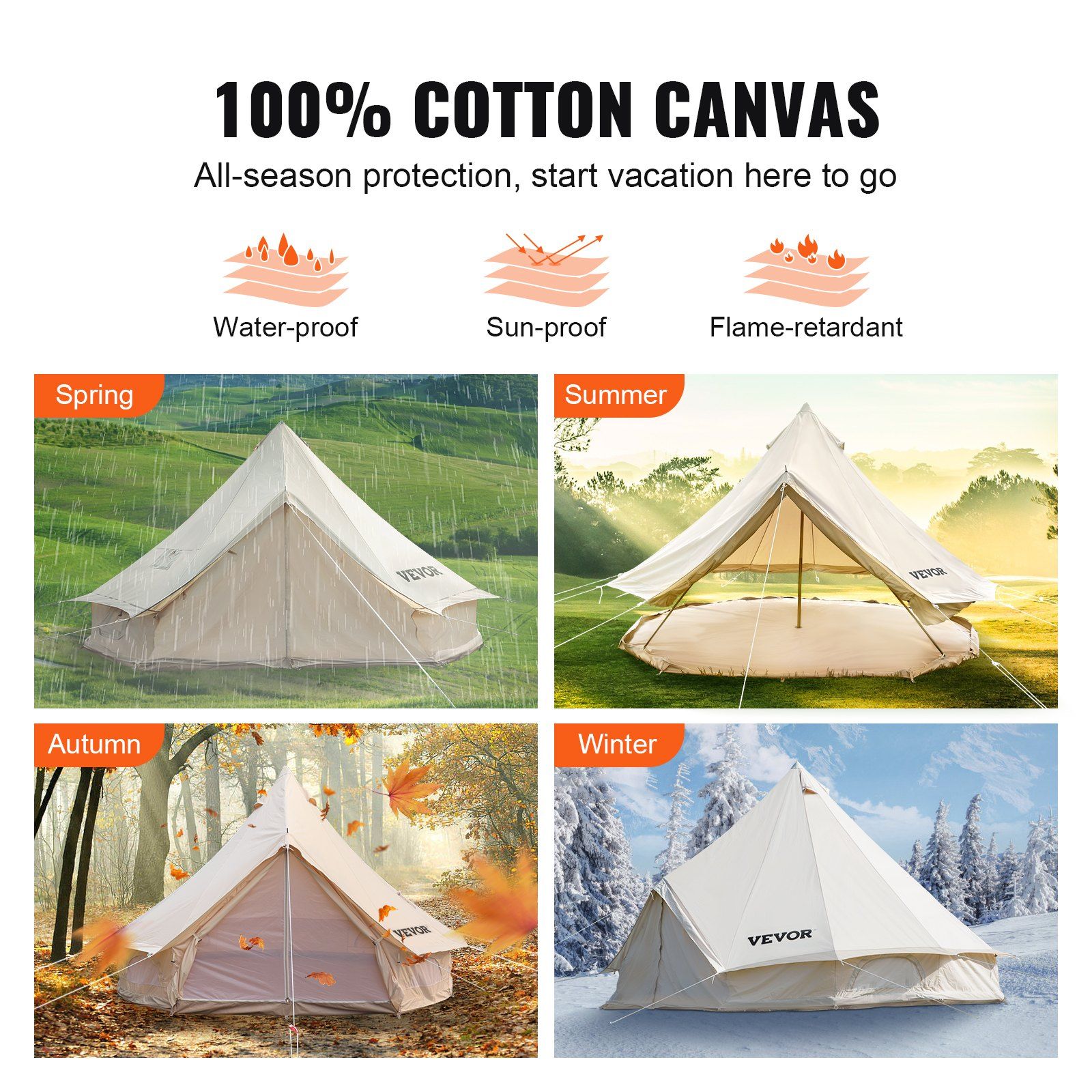 This 4-season waterproof bell tent is made of a 300gsm cotton canvas, which is sturdy and lightweight. Additionally, it is large enough for 8-10 people to sleep and firm enough against stormy weather. A stove jack is designed for winter, and complete accessories are included for easy setup. Thus, our tent is perfect for camping, hiking, backpacking, trekking, mountaineering, etc.