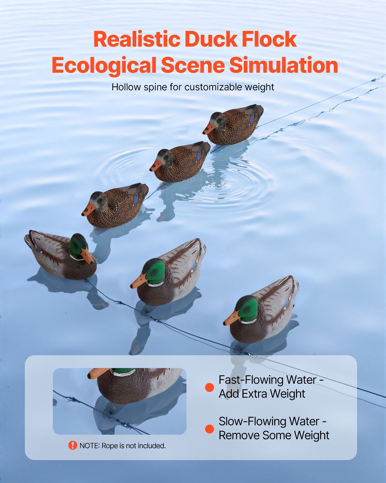2.6-Decoy Set Simulates Duck Flock Ecosystem: This outdoor duck decoy set includes 3 male ducks and 3 female ducks. The combination of different heights and postures recreates the real-life movements of a duck flock