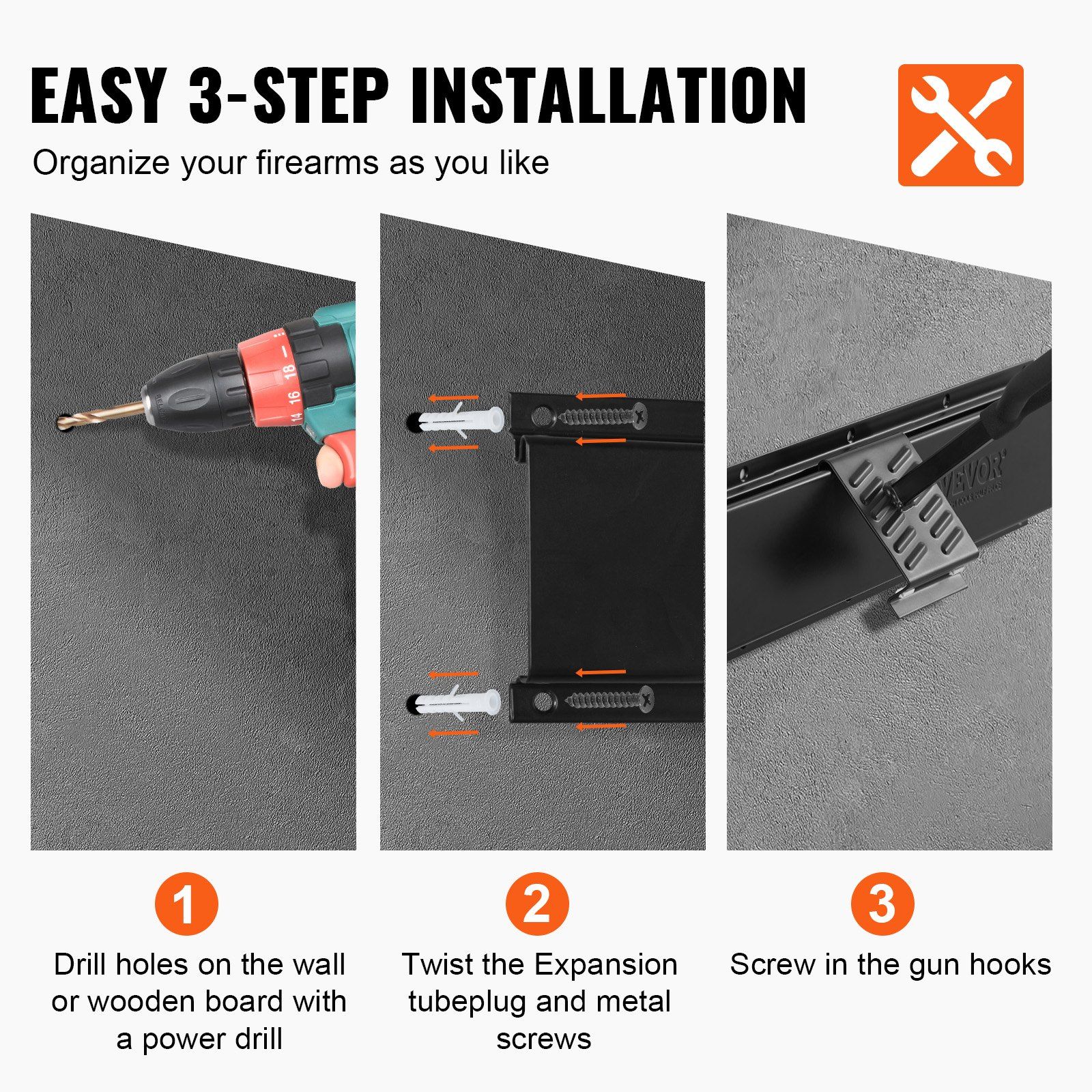 4.3-Step Installation: Easy and quick setup! Our user-friendly installation allows for hassle-free DIY assembly. Stainless steel screws firmly secure the indoor gun rack to your wall, ensuring stability and safety. Additionally, plastic washers on the screws prevent loosening for a stable connection.