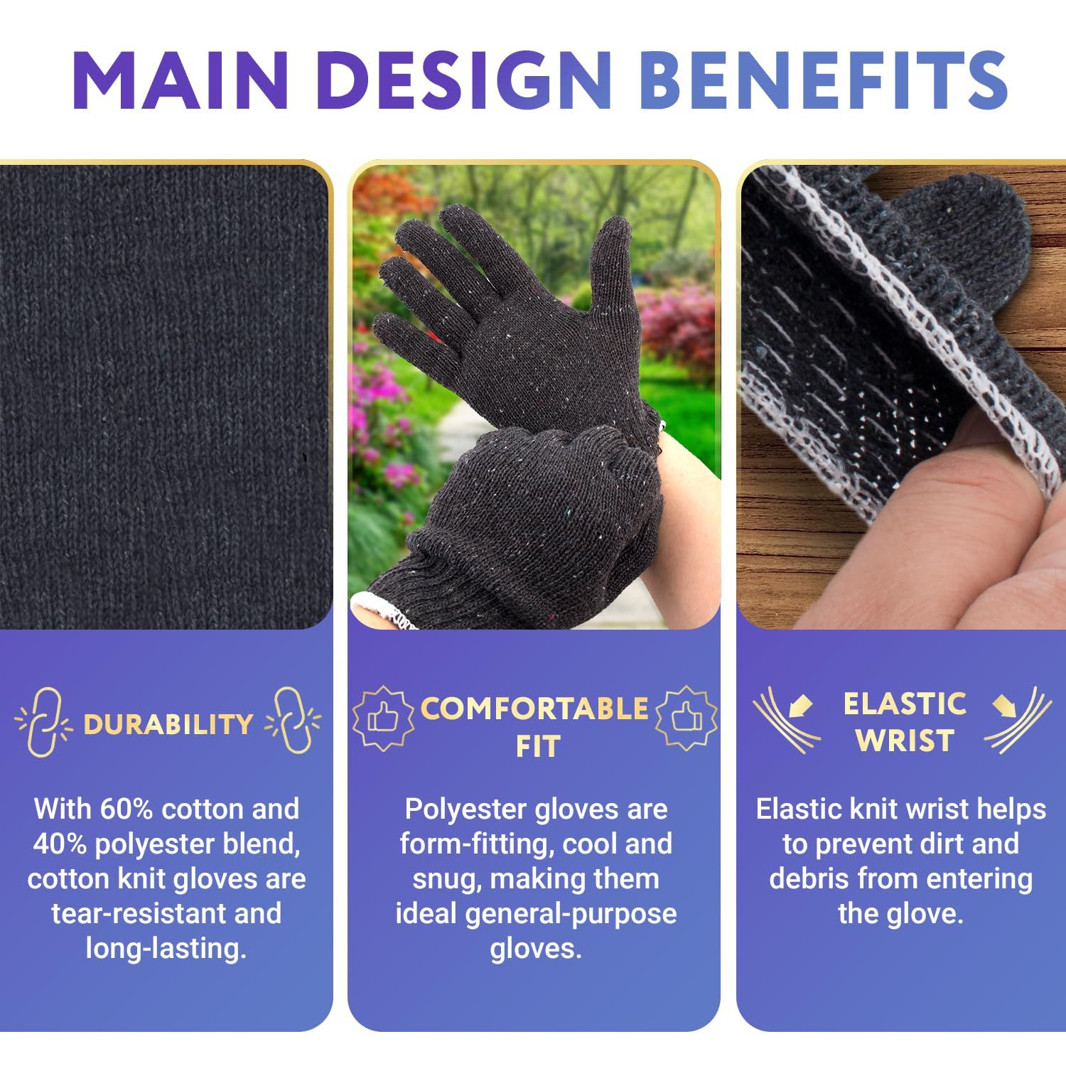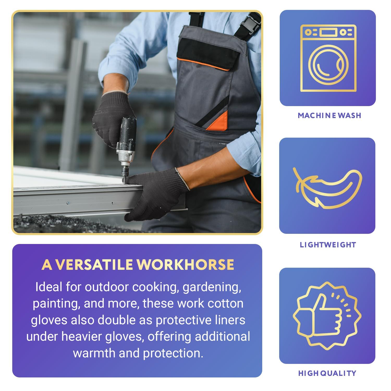 1.24 Pack of Cotton Gloves for Men and Women, 10 Inches. Cotton work gloves are versatile and suitable for any task, providing comfort and functionality for all. Cotton BBQ gloves keep hands warm so you can do what needs to be done without experiencing the discomfort of chilly fingers.