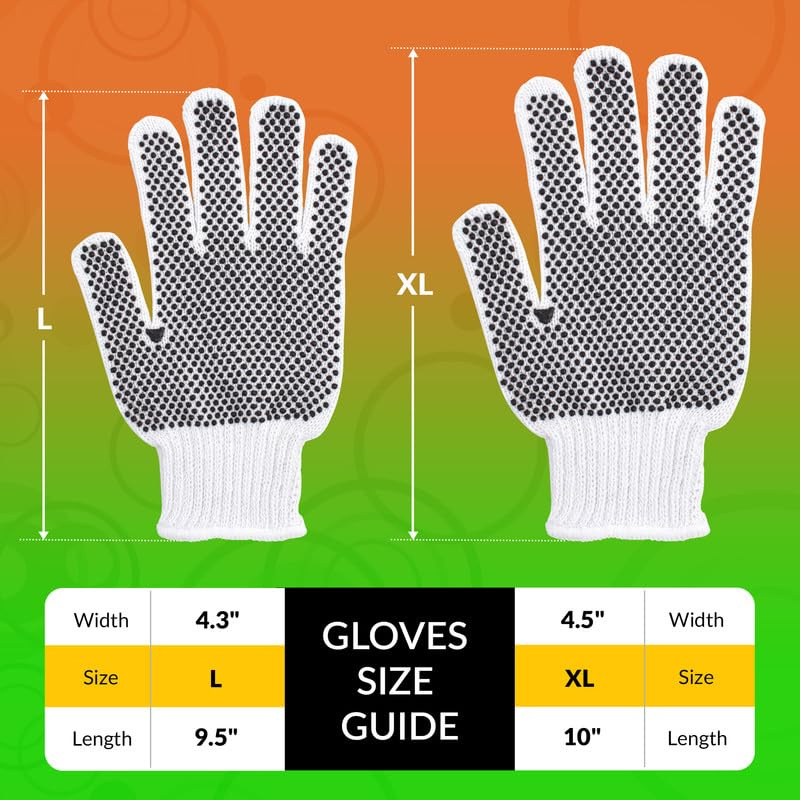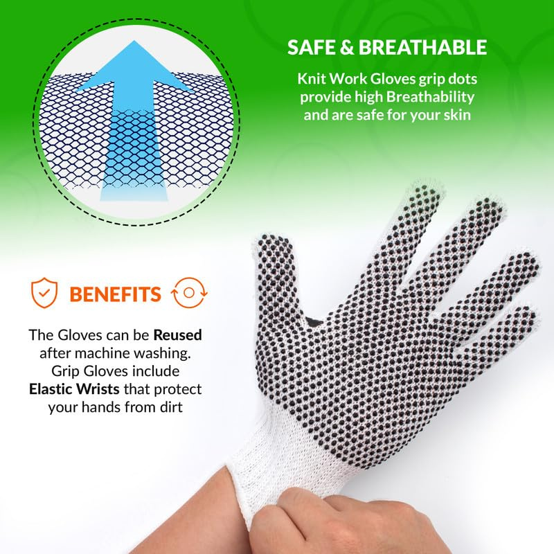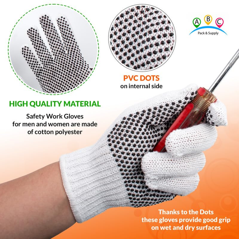 2.Enhance Grip and Safety. Cotton knit gloves feature anti-slip PVC dots on one side, ensuring a superior grip, even in the toughest conditions. A must-have for any toolbox, protective cotton gloves protect against abrasion, dust, and cuts without compromising flexibility.