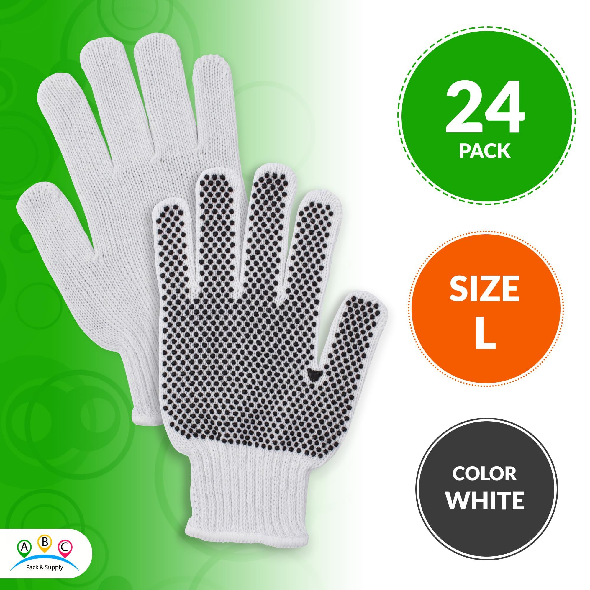 1.24 Pack of White PVC Dotted String Knit Gloves 9.5 inch. Cotton gloves for men, women, crafted from breathable blend of polyester and cotton, offer snug, comfortable fit. Light weight cotton gloves allow for complex operations and maintain cool or warm temperature.