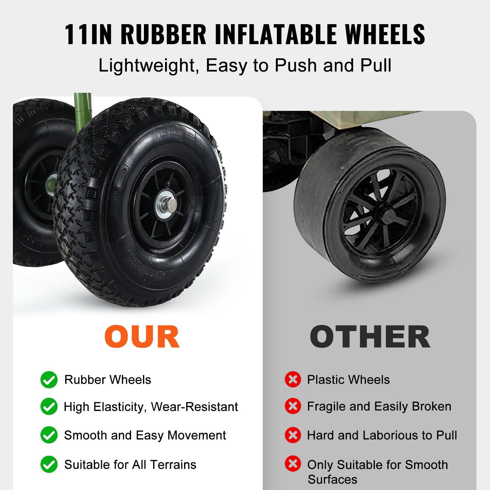 2.Practical Inflatable Wheels: This fishing beach cart is outfitted with 11-inch rubber inflatable wheels that glide over sand, mud, gravel, and grass like a dream. These wheels don't just carry your load; they make your journey to the perfect fishing spot as smooth as your favorite fishing line.