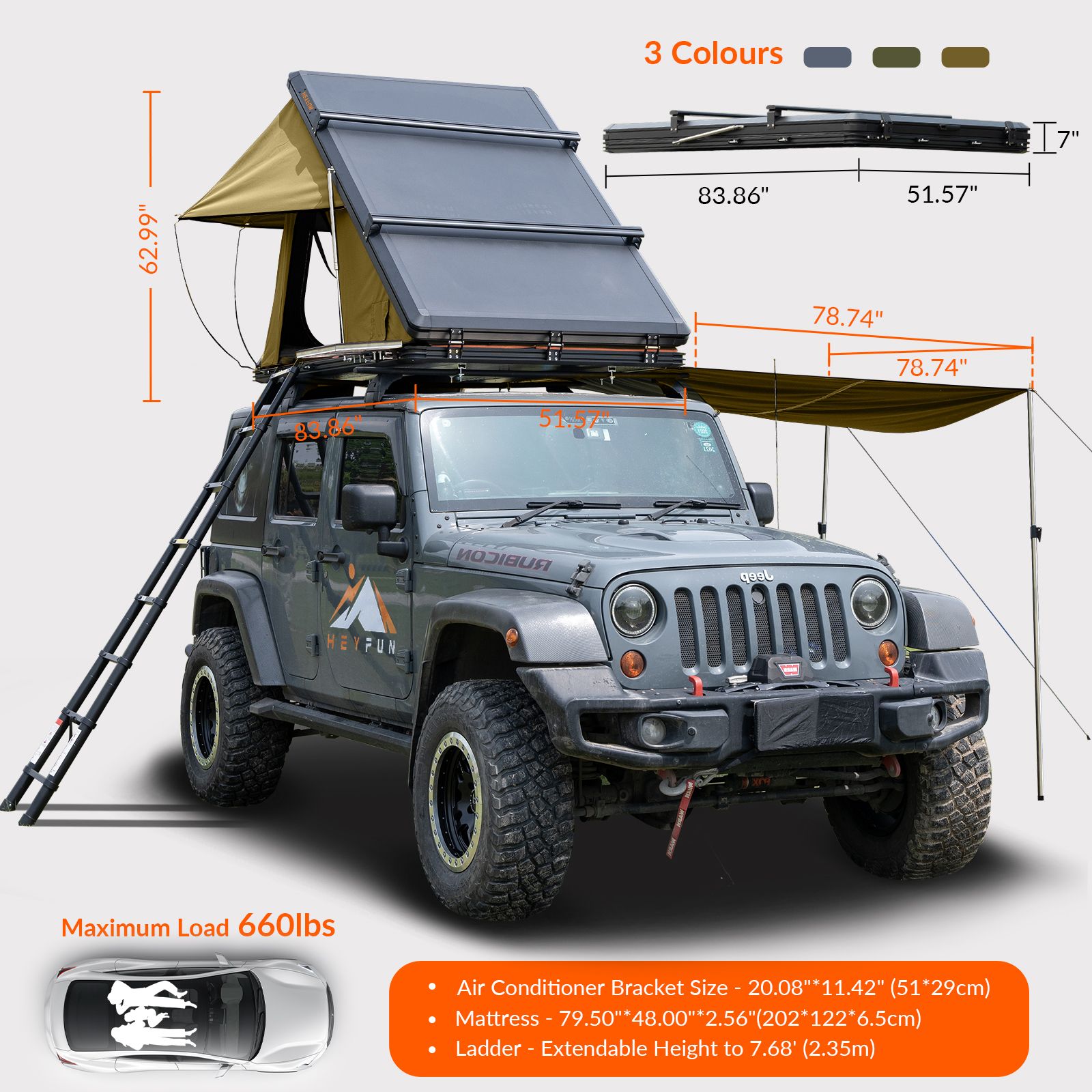 2. [Upgraded Roof Top Tent to 100% Market Excellence] - HEYFUN rooftop tents are standout options with premium features including extra attachable side awning, air conditioner outlet with detachable bracket, adjustable luggage racks and replaceable rain flies, best travel solution for carrying more luggage and perfect choice for camping enthusiasts and seasoned adventurers of all levels valuing quality and affordability.